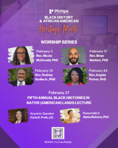 Black History & African American Heritage Month returns to Phillips Theological Seminary for 2026! We are excited to announce our programming throughout February, including our weekly worship series and a lecture to conclude the month.